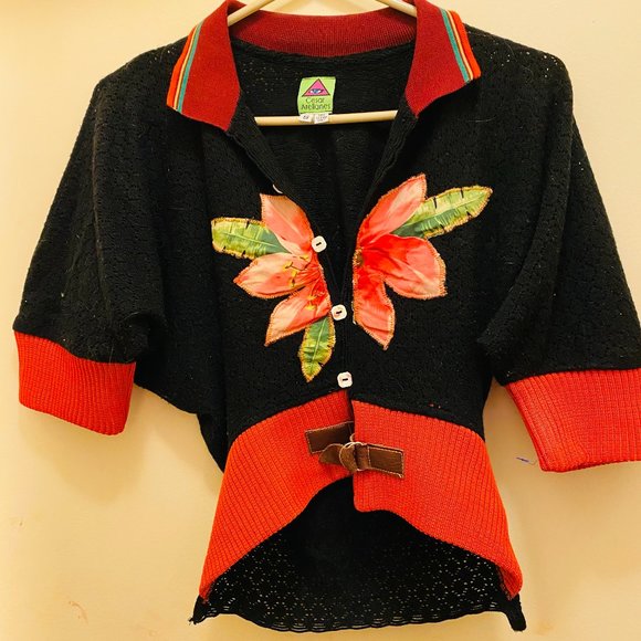 A beautifully and simply designed Cesar Arellanes sweater. Black in color with orange around the collar, sleeves, and bottom as well as a lovely flower design in the middle. Buttons to open and close the sweater with a low cut v-neck and a leather buckle for an additional look.