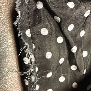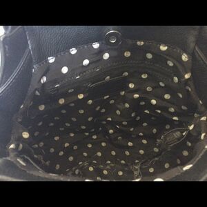 Cute designer purse by Elle in black leather,has a fun pocadot inside lining. Length is 11” and depth 8.5”. Lining has wear, see picture.