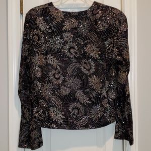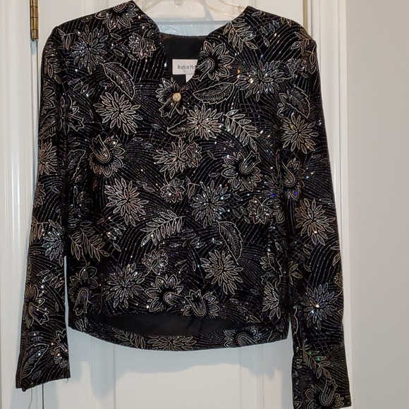 A beautiful womens dinner jacket that pairs well with black slacks or a skirt. No flaws at all!! Colors are black gold with a hint of silver. See pic's