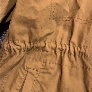 Perfect brown fall color. Quality material. Brass buttons/zippers. Conch was it that is adjustable on the inside. New without tags. Love it but it’s too big for me.