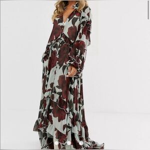 Romantic floral print maxi dress featured in a semi-sheer design with a button-up front and ruffled details for a sweet touch.