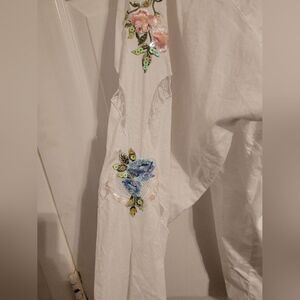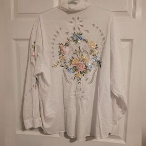 Beautiful top for any occasion. Made of all cotton materials. Tag says size 2X. Lightweight. Long sleeve. One one sleeve slightest color and one small fraying see pics. Both hard to see