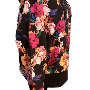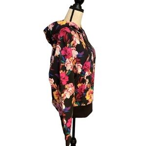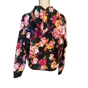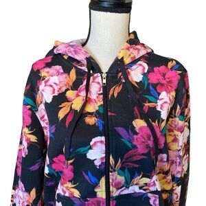 Beautiful floral zip up hooded jacket. Pockets, ribbed cuffs and waistband. Colors are vibrant with a dark grayish/black background.