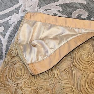 The skirt (more of a warmer gold than most of the pictures pick up) was worn a only a few times and is in perfect condition. There is no label because I had a lining added and it was removed. Size zero. Gold fabric has a shimmer in the light. Very elegant. Hidden zipper on the side. Hits just above the knee I'm 5'2".