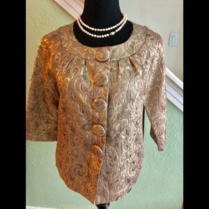 Beautiful gold statement jacket by Michael Kors in size small petite. Mixture of cotton, acetate and metallic. Completely lined. Closes with push buttons. Excellent used condition.