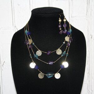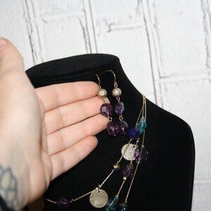 Beautiful gold layered necklace and earrings set with purple and blue beads