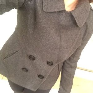 Dark gray wool pea coat. Gently worn. Will dry clean prior to shipping. Flaw- left pocket ripped through. Very warm and excellent durable material.