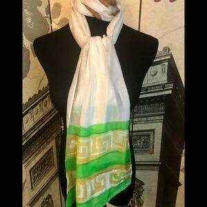 Beautiful long scarf . Does not have a label but it feels like silk. Gentle used condition.