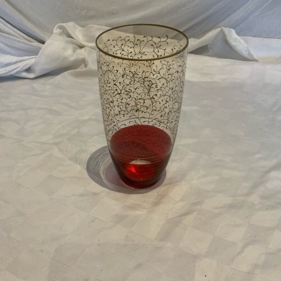 Large glass vase with beautiful hand painted designs and red accent. 10.5 in tall 5 in wide. No flaws! Perfect centerpiece for the table!