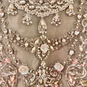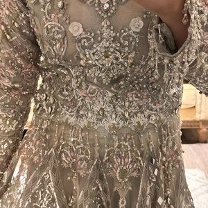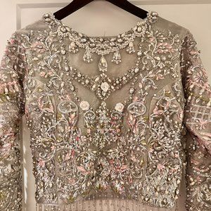 Beautiful heavily embellished lengha, only worn to try on. Nothing is wrong with it. Got it for wedding event but went with something different. Blouse was altered to be slightly smaller by a professional tailor but this can be undone if needed. There is a side zip on the blouse and adjustable waist for the skirt. lots of beading. dupatta is beautiful with beading on the side. Size is S/M