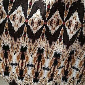 This has a drape neck and elastic at the waist. It has small loops for a belt if you wanted to wear one. Easy wear and care, slinky fabric!