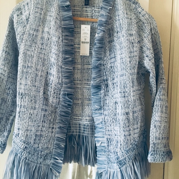 Frayed blue jacket, that goes great with jeans or dress pants. Brand new never has been worn. Tags still on