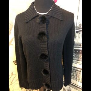 Beautiful knitted cardigan by Nina Leonard from the Metro 6 collection in size large. 70% acrylic and 30% wool. Closes with push buttons. Gentle used condition.