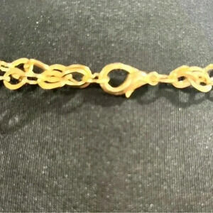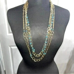 Long layered of multiple chains, this gold toned necklace boasts blue accent beads. Lobster clasp closure. Uniquely designed. Definitely adds a layer of style to your outfit. Nicely made.