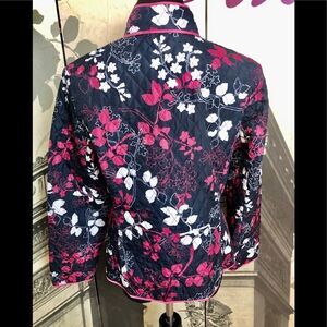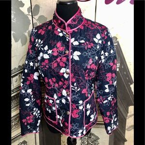 Beautiful lightweight jacket in pink and dark blue. Made by Kim Rogers from the Signature collection in size medium petite. Great jacket for spring. Has front pockets. In great condition.