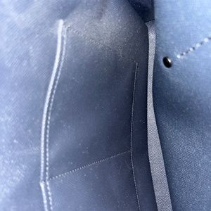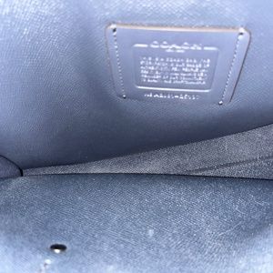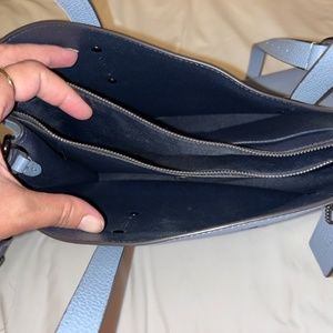 Beautiful slate blue leather Coach purse Hardly used, bought from Belk. Three divided sections, one section has 2 side pockets. Purse handles and an adjustable shoulder strap. Quality craftsmanship! Great size not too small or too big. Width 13 and 3/4”. Height of purse itself 9”.