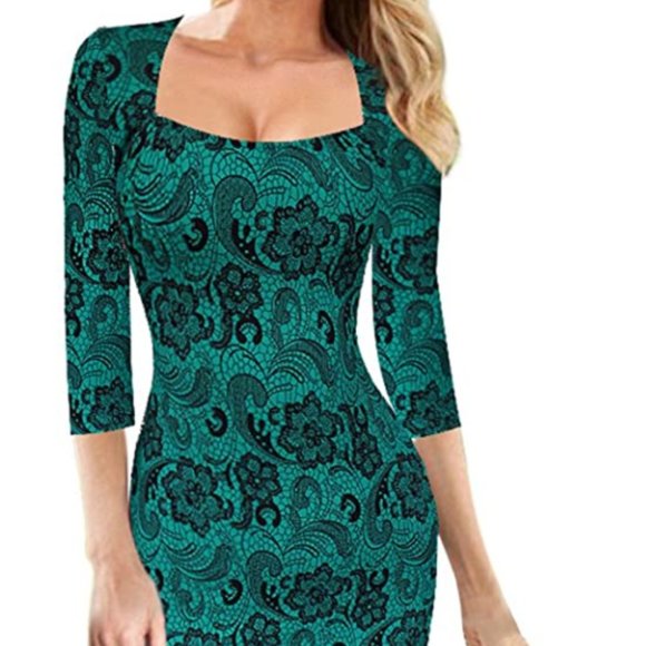 Style: Sexy Square Neckline, Has 3/4 Slleeves. Slim Fitting, Sheath Silhouette, A Concealed side Zipper,