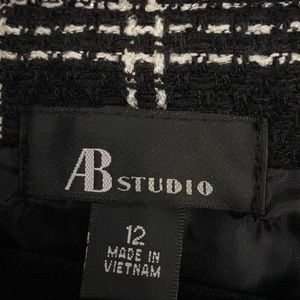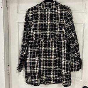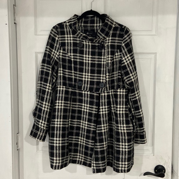I’m great condition. Black, white and silver checkered jacket. Very light. With side pockets and 4 big buttons in front.