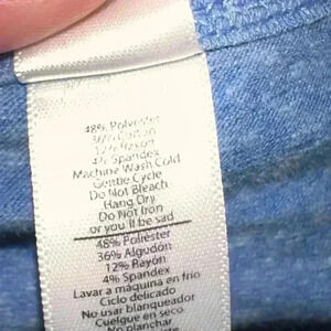 Beautiful blue! Pit to pit 18.5” , length in front 25” , length in back about 28” . 48 % polyester, 36 % cotton, 12-% rayon. Made in Guatemala .