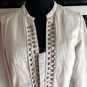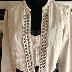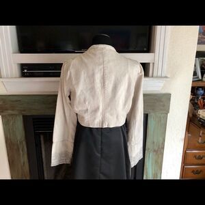 Beautiful jacket by Anna Scott size 12. This is a new jacket with tag but it has a small stain on the collar. See picture. Nice metal decorations . Closes with hooks. Body is lined.