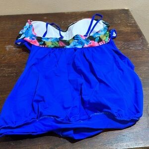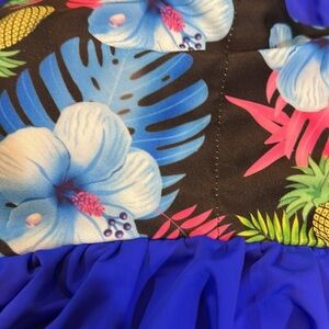 Beautiful one piece bathing suit with blues in the top has flowers and pineapples. I can find no tags on this bathing suit.