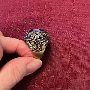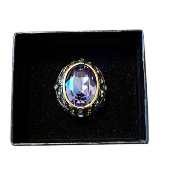 Beautiful ornate sparkly ring large purple center stone smaller blue stones EUC