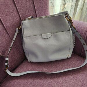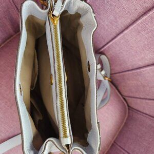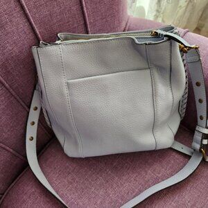 This is an American Leather Company light blue handbag. It is the perfect size. Large enough with many compartments for organization, yet small enough to use as a cross body bag. The measurements are 12"W x 10"Tall. It has gold/brass hardware with braided stitching on each side. The front has a large slip pocket, and the back has a snapped pocket. There are 3 sections to the inside. The front section has 2 slip pockets. The center is a zipped section. The final section also has a smaller zipped pocket. The handbag is a beautiful pebbled leather with absolutely no stains or scratches.