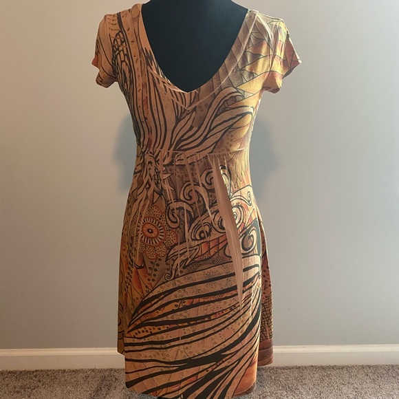 Comfort V neck front and back dress with beautiful print. Fits like a fitted T on top and slightly A-line