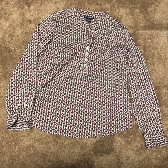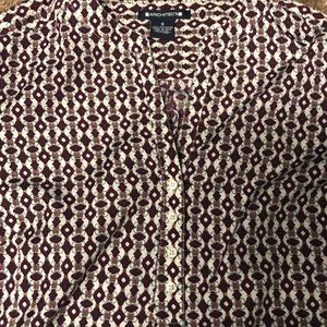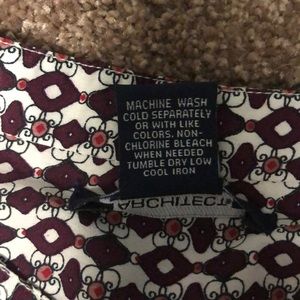 Architect, size S, pattern is maroon on white background, 1/2 button placket with button cuffs, 26.5” in length, EUC