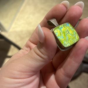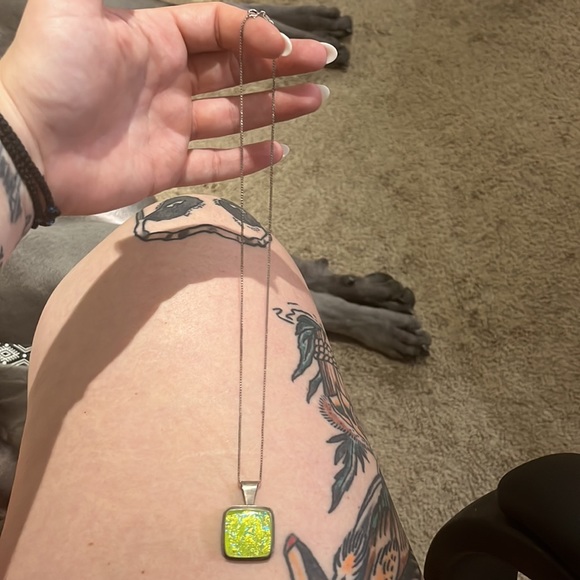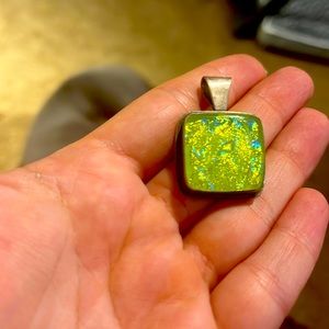 Chain and pendant are silver with a beautiful blown glass front. It is smooth and closed into the pendant. Made by an artist. Chain from Italy.