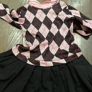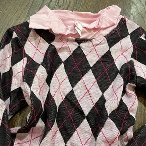 Preppy Pink & Black Argyle Sweater Dress. This charming dress features a classic argyle sweater top in shades of pink and black with fine red detailing, combined with a solid black skirt. It has a sweet pink collar and cuffs for a layered look. Perfect for a smart-casual, school-day, or cozy special occasion style!