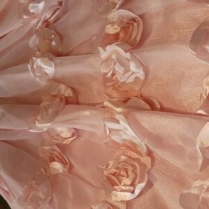 Zip up back with belt. Sleeveless 100% polyester with shiny satin lining. Flowers across the waist and in rows all around the skirt. Round high neckline. Great for Easter, pageant, flower girl.