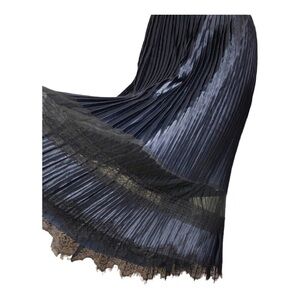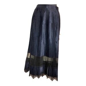 Beautiful pleated navy blue sateen satin look black lace trim detail peek a boo twirl circle skirt size large