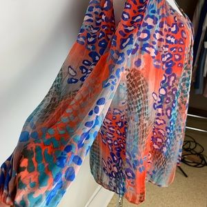 Beautiful print top, by Boston Proper, elasticized, cuffs, and cold shoulder, lined, excellent condition