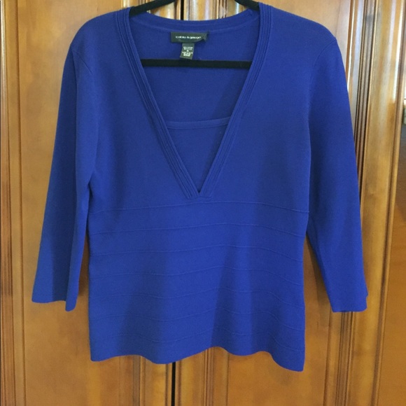 Beautiful blue pullover would be great with a pair of dress slacks. 62% viscose 33% nylon. Size medium never worn but does not have any tags