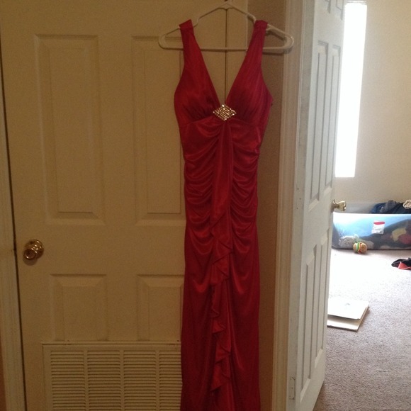 Red formal dress. Fits very well. Very flattering fit. Needs to be dry cleaned.