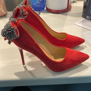 Beautiful red high heels pumps with shiny rhinestones bow on back of heels.