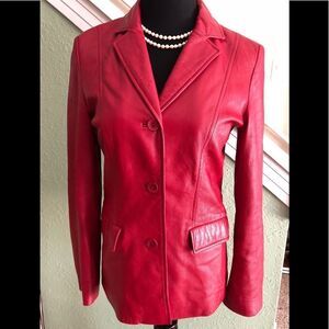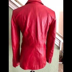 Beautiful red leather jacket by Reaction Kenneth Cole in size small. Very nice quality leather. Form fitting jacket. Has 2 pockets and 1 inside pocket. Very light wear , great condition.