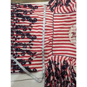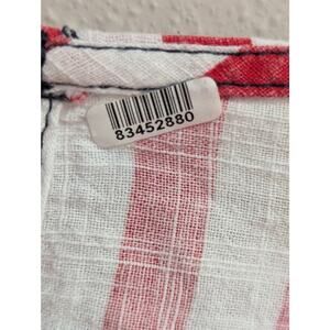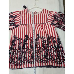 Beautiful red & white cotton striped dark blue Paisley embroidered peasant blouse size approx XL hippie boho festival wagon look costal neutral beachy layering cottagecore Renaissance Faire Valentine Day Romantic date night girls weekend getaway concert shower church graduation vacation photos circus candy striped tassels pom pom trim ** see pics for measurements