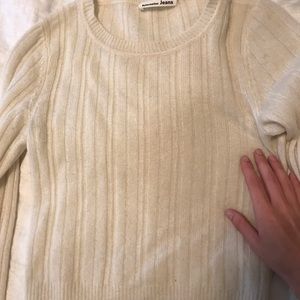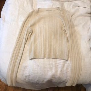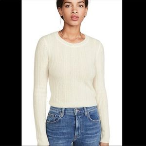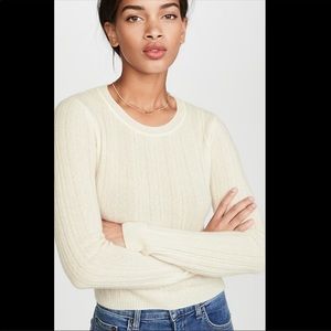 Super beautiful ribbed cashmere crew from reformation in a size small. In great condition! There is a slight imperfect that was corrected and is not noticeable when worn that is pictured. 70% recycled cashmere. 25% new cashmere and 5% wool. Super cozy, it’s just a little too cropped for my liking. Not super cropped but definitely needs to be worn with higher wasted pants. Ivory color