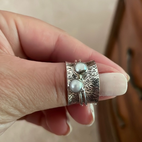 Silver with two pearls ring. The two little rings with pearls move. Never used. New