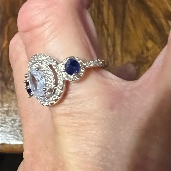 Beautiful CZ real silver with blue accent stones on each side. Just too big for my small hands.