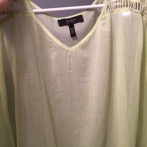 Beautiful see through yellow flowy top by the Jessica Simpson brand! It does seem to have a couple nick's in the front that I had to look hard at to realize were there. It also says XS/S but I also wore it a bit tighter as a medium