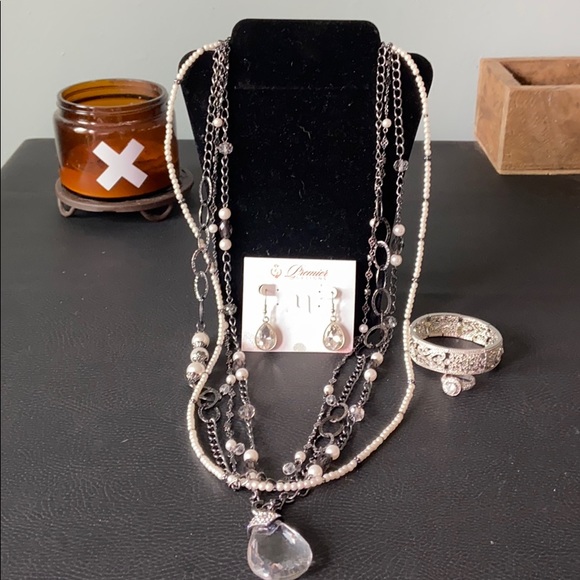 This set is beautiful, pictures do not do it justice. All worn a few times. Necklace can be worn multiple ways. Bracelet is stretch and ring is size 7.