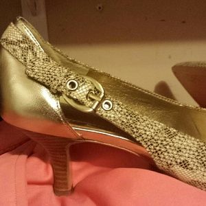 Cream and black colored faux snake skin kitten heels with gold in back, barely worn