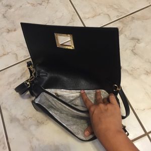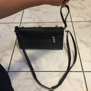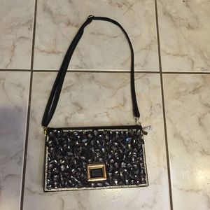Here I have this absolutely beautiful black shoulder bag that can be converted into a shoulder bag, clutch, and a wristlet bag. It has 2 inner sections. It has the most stunning jewels as flowers and outlined with rhinestones. New never used! Great for a girls night out!