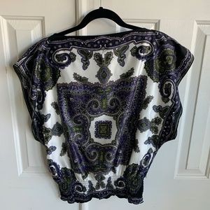Barely worn size small silky multi colored blouse with elastic at the bottom. 100% polyester.