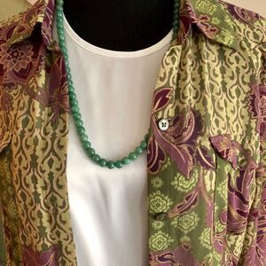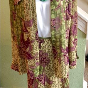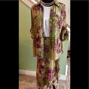 Beautiful long sleeve shirt and skirt by Evan Picone. The shirt is a size large and the skirt is a size 10. 100% polyester. Sleeves can be worn rolled up or down. This is a light material. Can be worn several different ways. I am showing it with a tank, that’s not included. Measured across the waist is 15”.