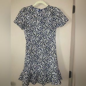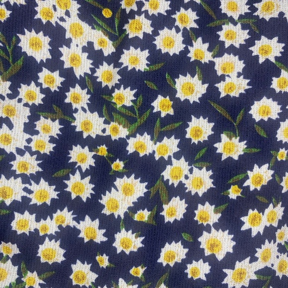 Beautiful pattern, perfect for the spring just add a pair of sneakers or for fall add some tights/leggings with a pair of boots. It’s a navy blue base with small flowers. Nice fit to the body and breathable fabric.