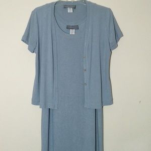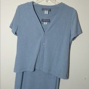 Sophisticated enough for work and comfortable enough for play. Light blue maxi tank dress with side slit and matching button down top. Flattering drape. Great for travel. Never worn.